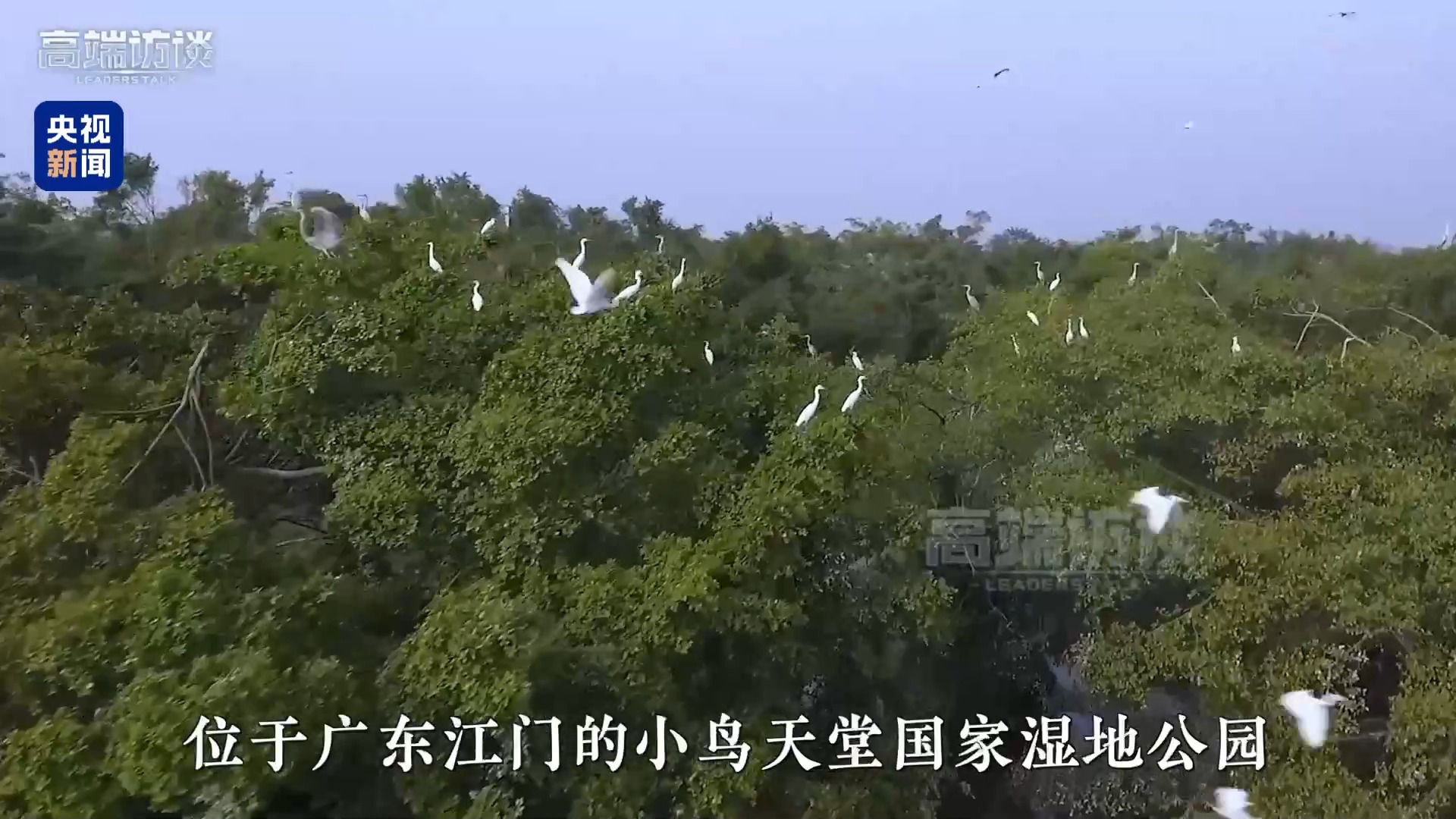 总台记者 邹韵:小伙伴们,快看看这个语文书的封皮,是不是开心的记忆“嗖”的就回来了!再顺着我的手往这看啊,《鸟的天堂》,这是巴金先生在1933年创作的一篇散文。这篇文章被选入到了语文课本当中,所以可能很多像我这么大的孩子都是读着这篇课文长大的。今天我们来到了位于广东江门的小鸟天堂国家湿地公园,站在这欣赏这样的美景,真的觉得课文里的场景照进了现实。400多年前,有一棵榕树在这里生根,如今已经繁衍成了万鸟栖息的生态奇观。今天我们来到这里,是来见一位我们《高端访谈》的老朋友。